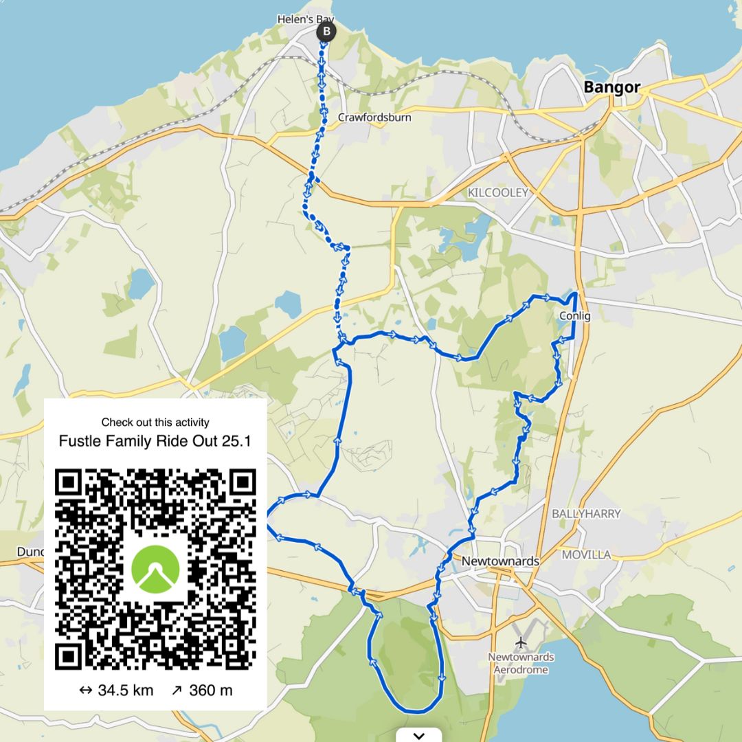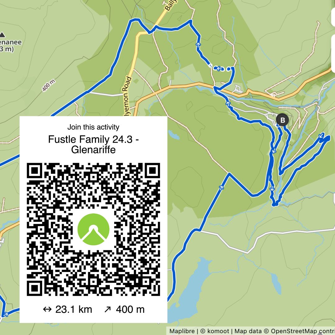 Used for our Fustle Family Ride 24.3 in November 2024 , this route takes in the hills above Glenariff and contains approximately 14 miles of riding with around 1300ft of elevation.